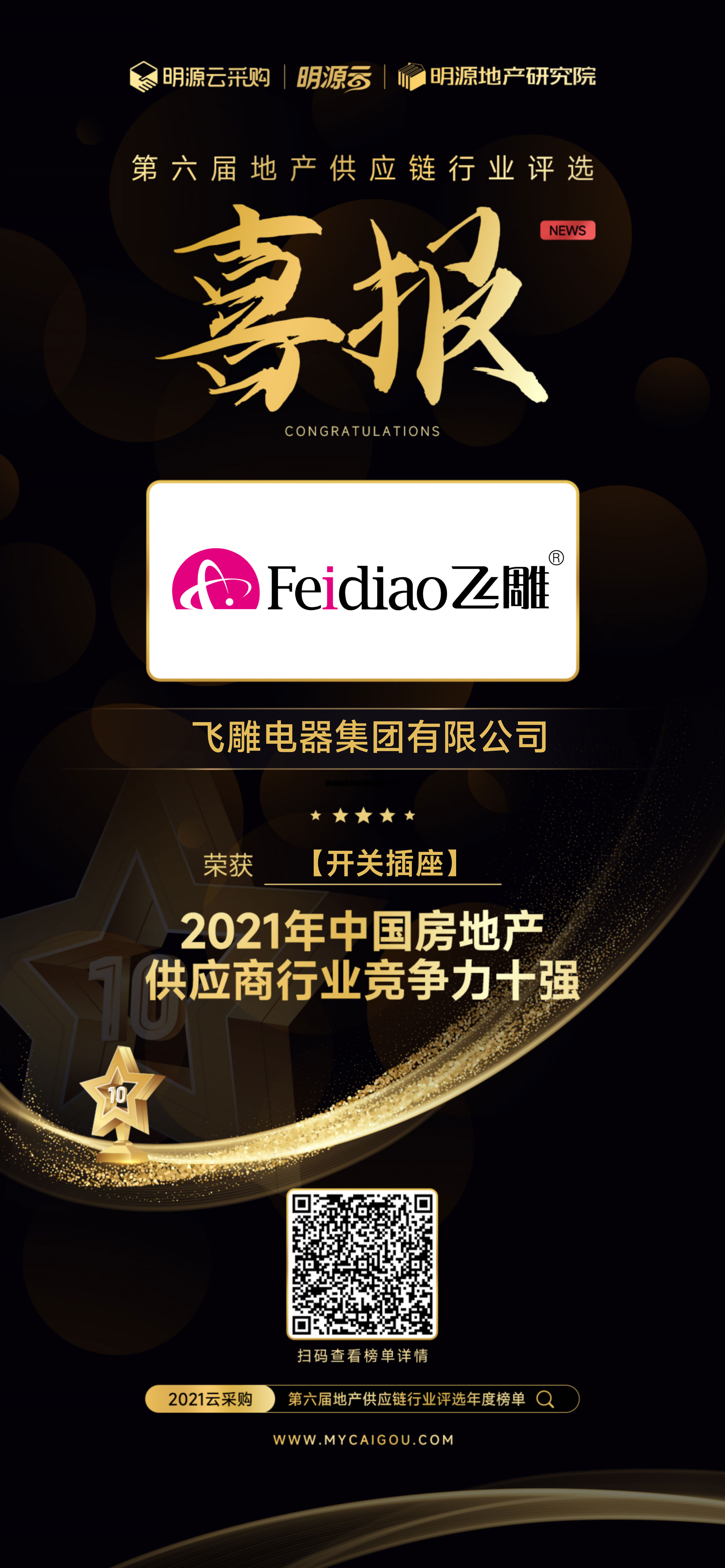 喜讯!飞雕电器集团荣获2021中国房地产供应商行业竞争力十强!(开关插座)